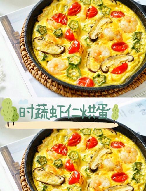 1. 虾仁蔬菜烘蛋:鸡蛋打散混合菠菜、虾仁,烤箱180℃烤15分钟。